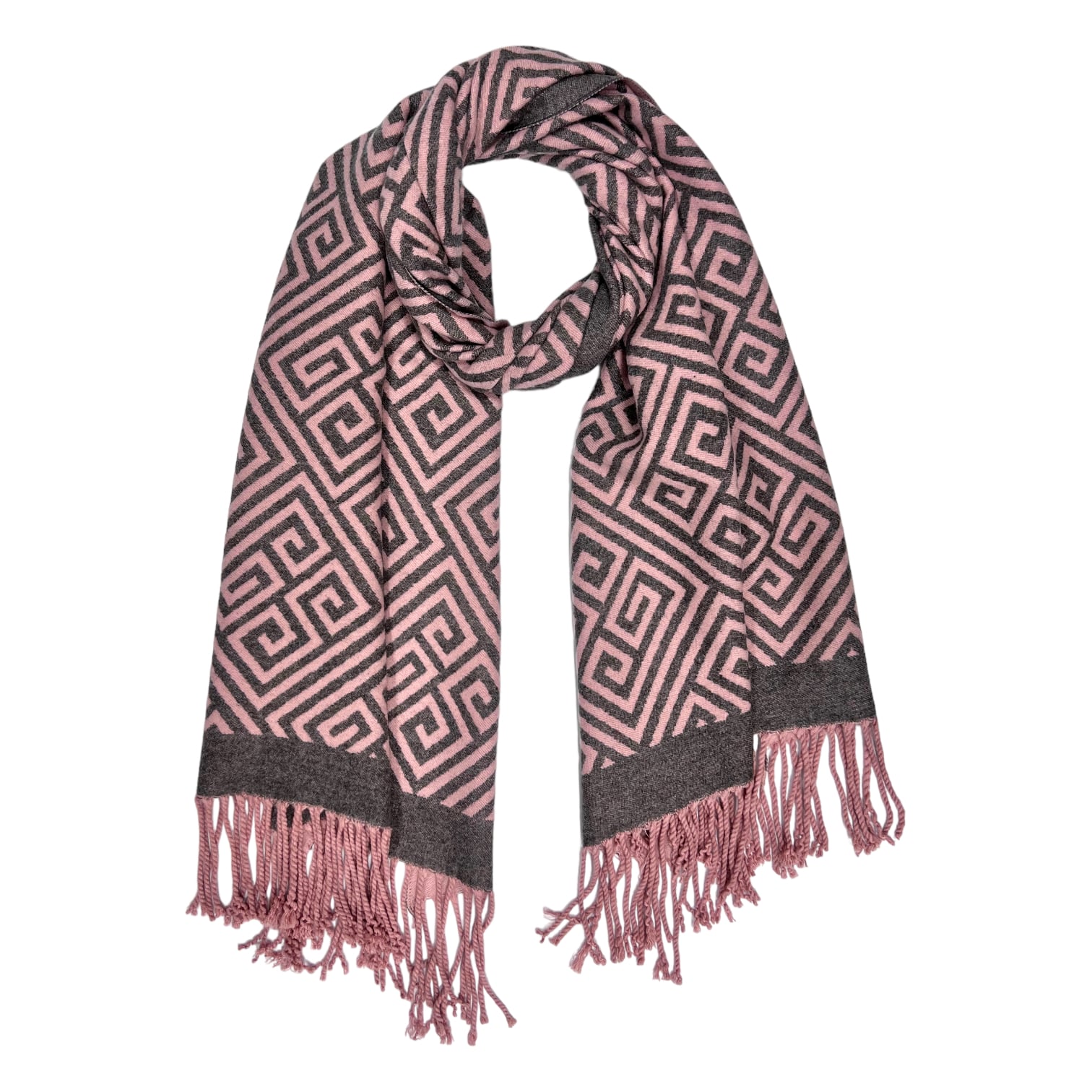 Maze print on a cashmere blend scarf. Scarf is finished with tassels on each end.